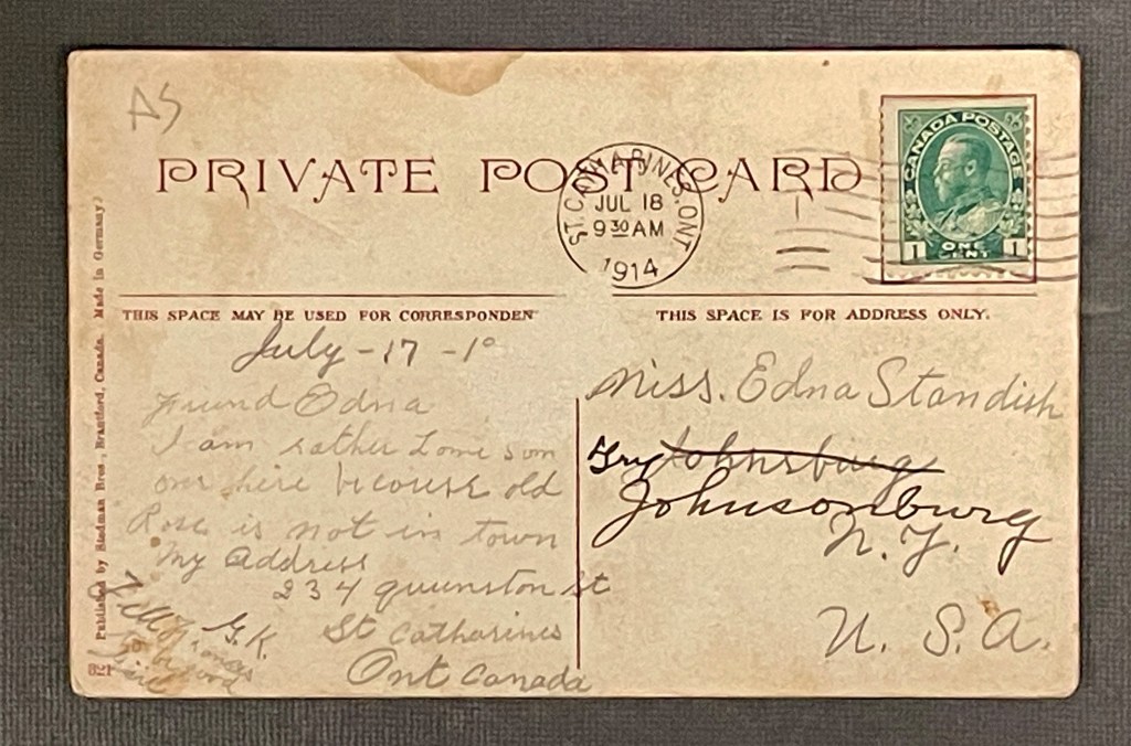 Handwritten messages on the backs of postcards turn items like this from mass-produced forms of visual culture to objects that hold personal meaning. Research conducted at the St. Catharines Public Library provided further information about the sender of this card. Walter Bray wrote this message to a woman named Miss Edna Standish from Johnsonburg New Jersey. Bray lived at 234 Queenston St. in St. Catharines, and he wrote this note on July 17, 1914 [2]. It reads: “Friend Edna, I am rather lone sum over here because old Rose in not in town. My address [is] 234 Queenston St. St. Catharines Ont Canada.” There are many unanswered questions about the interaction that the city directory or other sources cannot explain. Who was Miss Standish to Mr. Bray and what was their relationship? Even without these answers, getting a glimpse at this small interaction reminds us that history is shaped by countless personal stories.