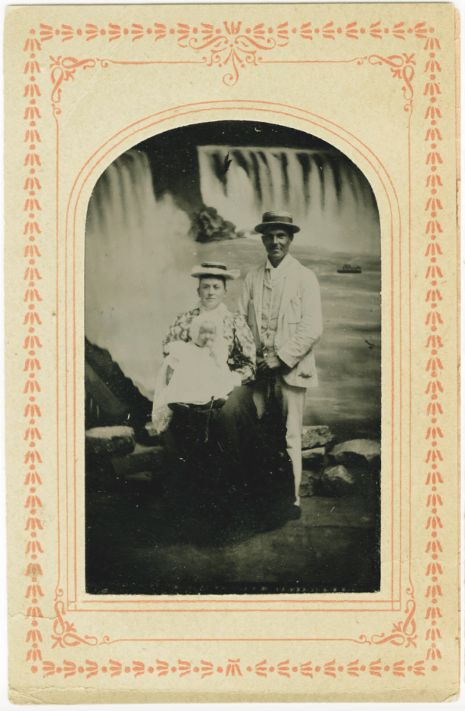 This image is a tintype of a couple with their son in front of the Niagra Falls. It was taken around 1897. The tintype was a popular form of 19th century photography where image was printed on metal. This was a relatively affordable form of photography and allowed for frequent, casual photographic documentation, especially compared to the daguerrotype. [1]